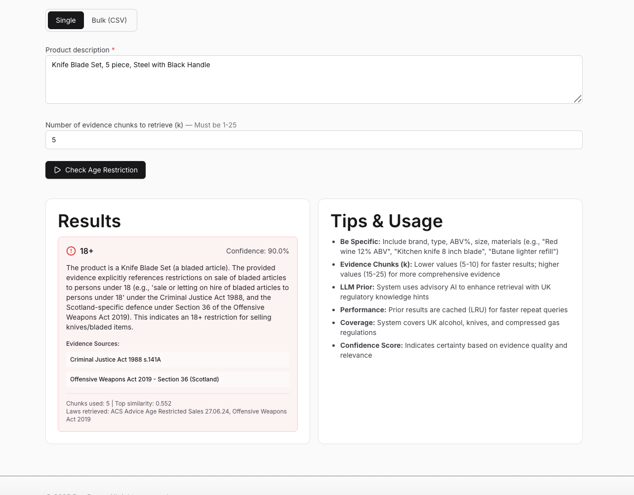 Production RAG system that identifies age-restricted products using hybrid retrieval across UK legislation with confidence scoring and evidence citations.