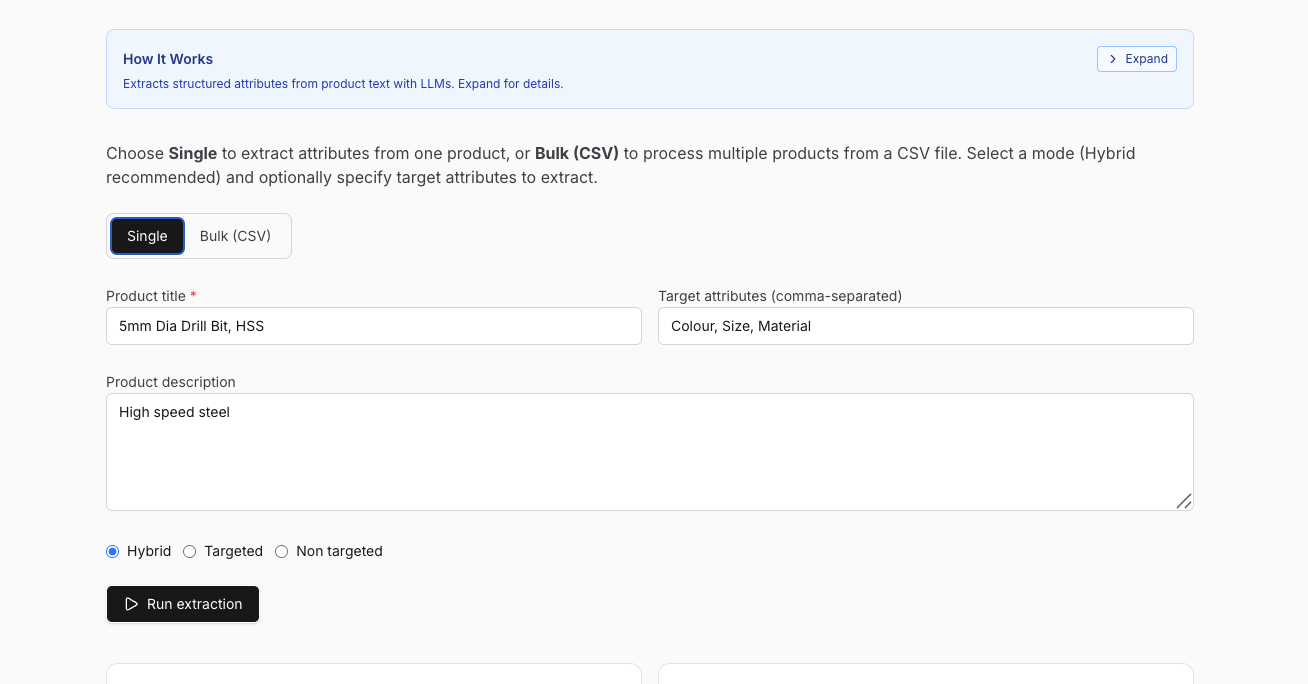 Lightweight API that extracts structured attributes from messy product text to improve search and tagging.