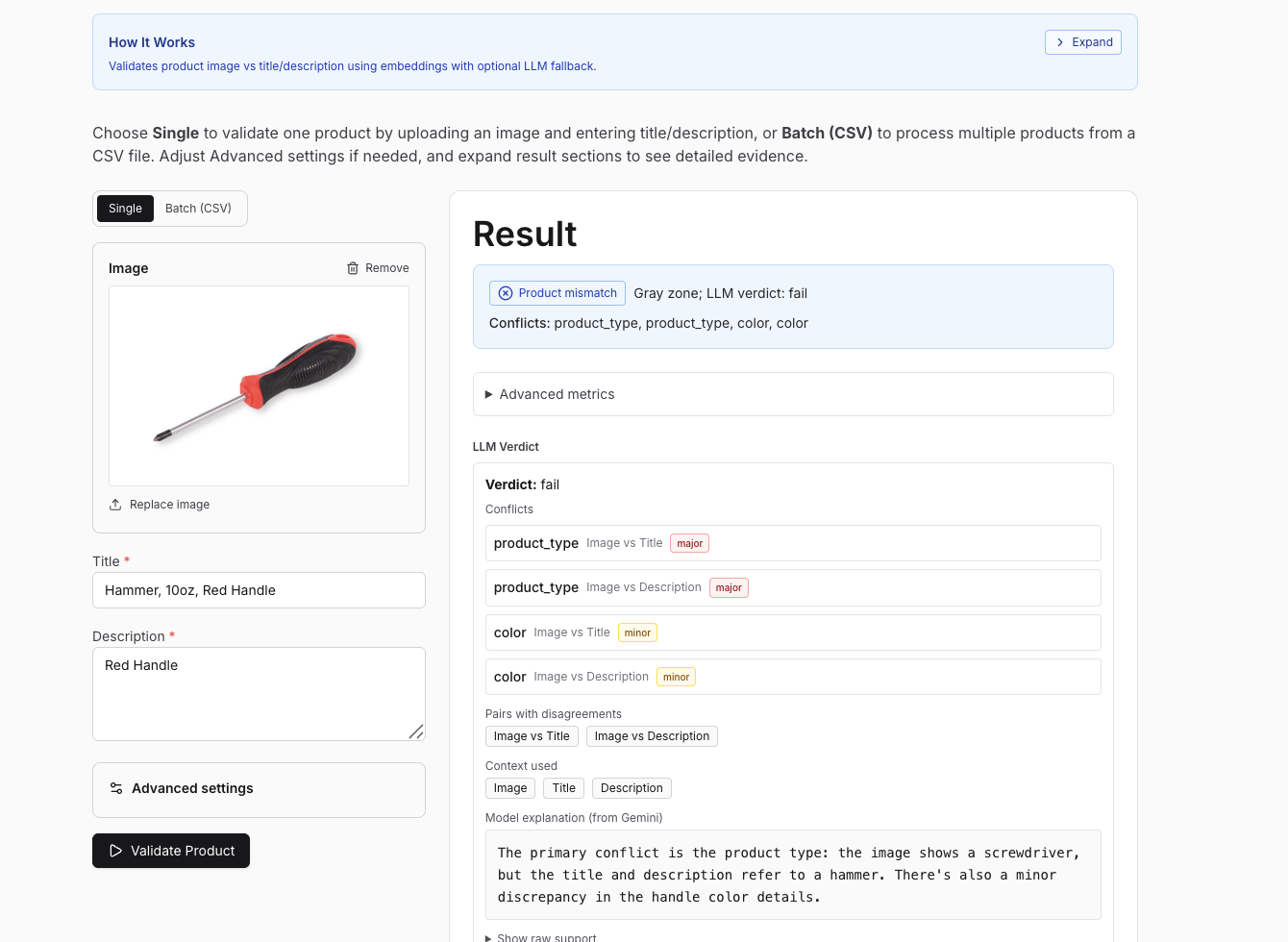 Embeddings-first product validation that compares image vs title/description with Gemini fallback in gray zone.