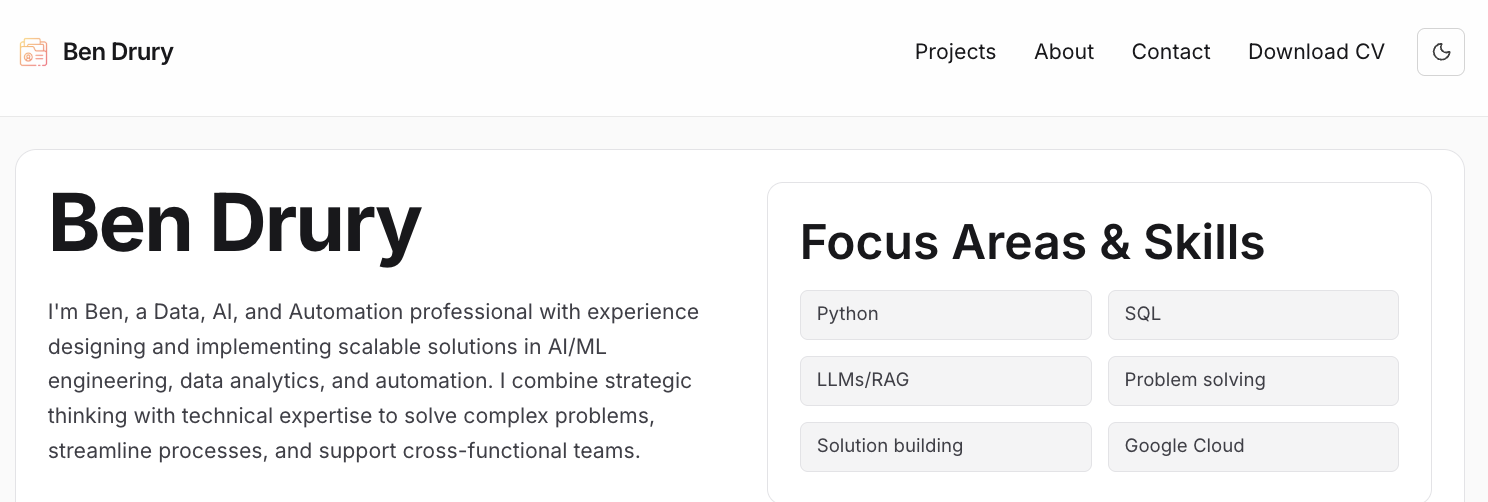Overview of how this site is built: Next.js + TS, Tailwind, Vercel, secure API proxy, and live demos.